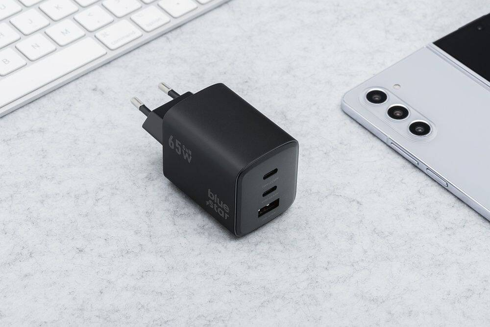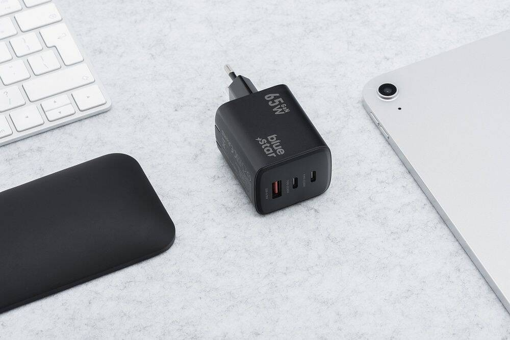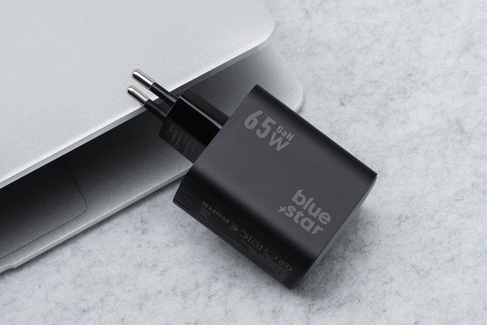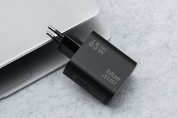 Ładowarka sieciowa Blue Star wykonana w technologii GAN, o łącznej mocy 65 W. Obsługuje standardy ładowania Quick Charge 4.0, Power Delivery oraz Super Fast Charging 2.0 i pozwala na ładowanie zarówno telefonów i tabletów, jak i laptopów. Posiada trzy porty – dwa USB-C i jeden USB-A – i umożliwia zasilanie trzech urządzeń jednocześnie.