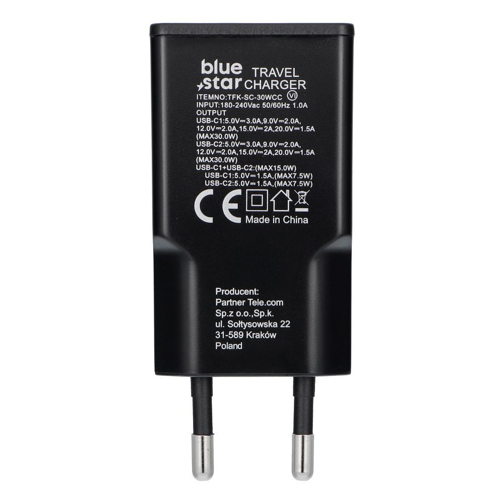 Ładowarka sieciowa do telefonu Blue Star Slim GaN 2 x USB C QC4.0 PD 3A 30W TFK-SC-30WCC czarna