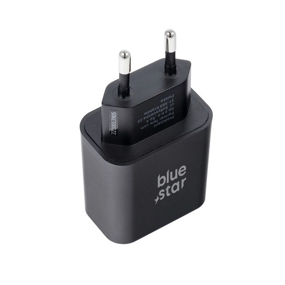 Ładowarka sieciowa Blue Star z funkcją szybkiego ładowania. Obsługuje standardy ładowania Quick Charge i Power Delivery, co pozwala na błyskawiczne ładowanie urządzeń wspierających szybkie ładowanie. W zestawie odpinany ksbel USB-C do USB-C.