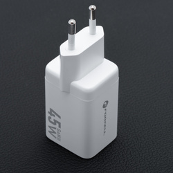 Ładowarka sieciowa Forcell Mini GaN III 45 W oferuje wysoką efektywność przy minimalnych rozmiarach. Obsługuje Power Delivery (PD), Quick Charge 4.0 i Super Fast Charging 2.0, co pozwala na szybkie ładowanie smartfonów, tabletów i innych urządzeń. Wyposażona w dwa porty USB-C pozwala na jednoczesne zasilanie dwóch urządzeń.