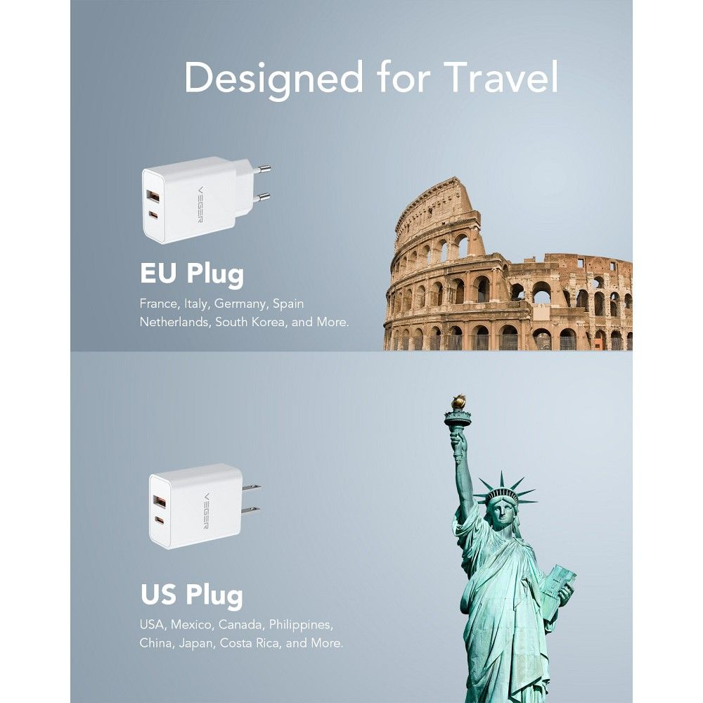 Ładowarka sieciowa Veger z dwoma portami: USB-C i USB-A. Wpiera standardy szybkiego ładowania.