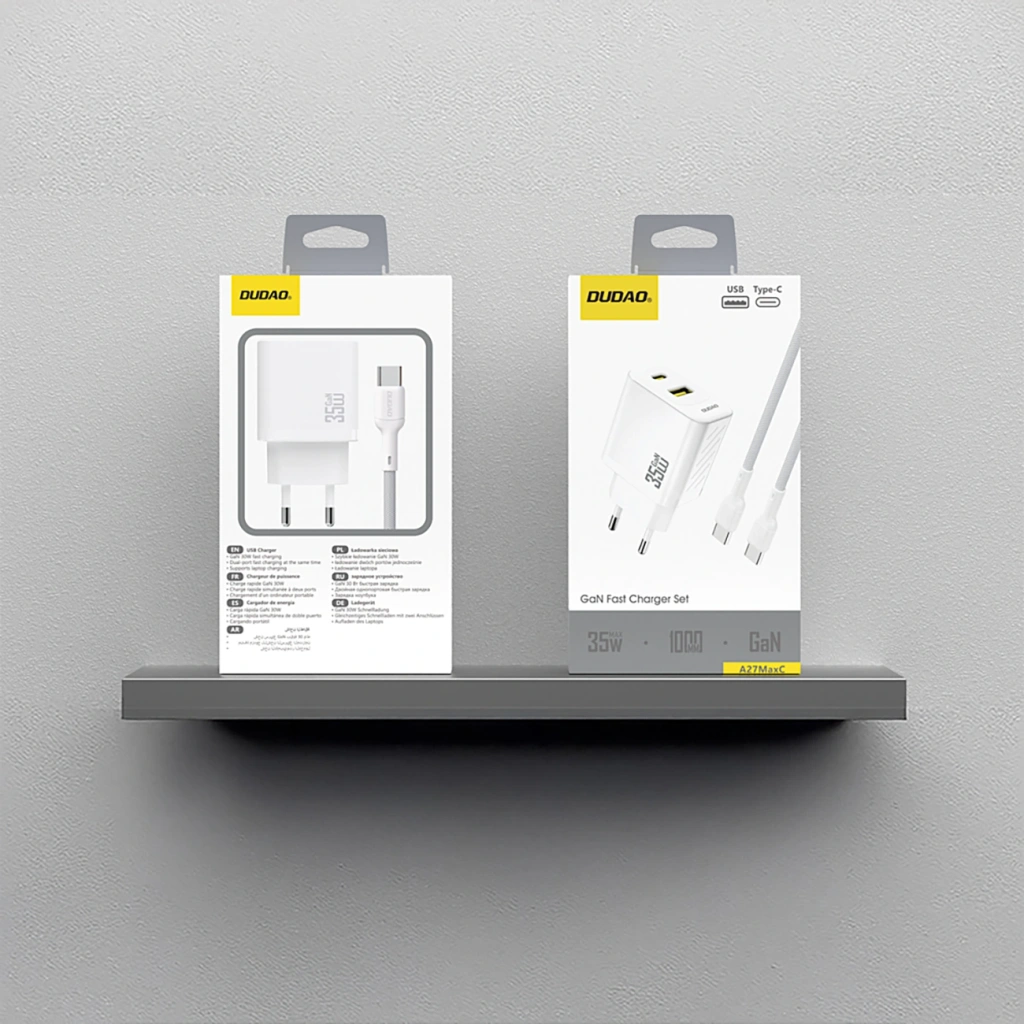 Ładowarka sieciowa Dudao A27MaxCEU to wydajne i kompaktowe rozwiązanie do codziennego ładowania urządzeń mobilnych. Moc do 35 W pozwala szybko uzupełnić energię w smartfonach, tabletach i innych kompatybilnych sprzętach. Dwa porty - USB-C oraz USB-A - umożliwiają jednoczesne ładowanie dwóch urządzeń, zwiększając wygodę użytkowania w domu, biurze i w podróży. Obsługa Power Delivery i Quick Charge zapewnia sprawne i stabilne ładowanie. W zestawie znajduje się kabel USB-C o długości 1 m, dzięki czemu ładowarka jest gotowa do użycia od razu po wyjęciu z opakowania.