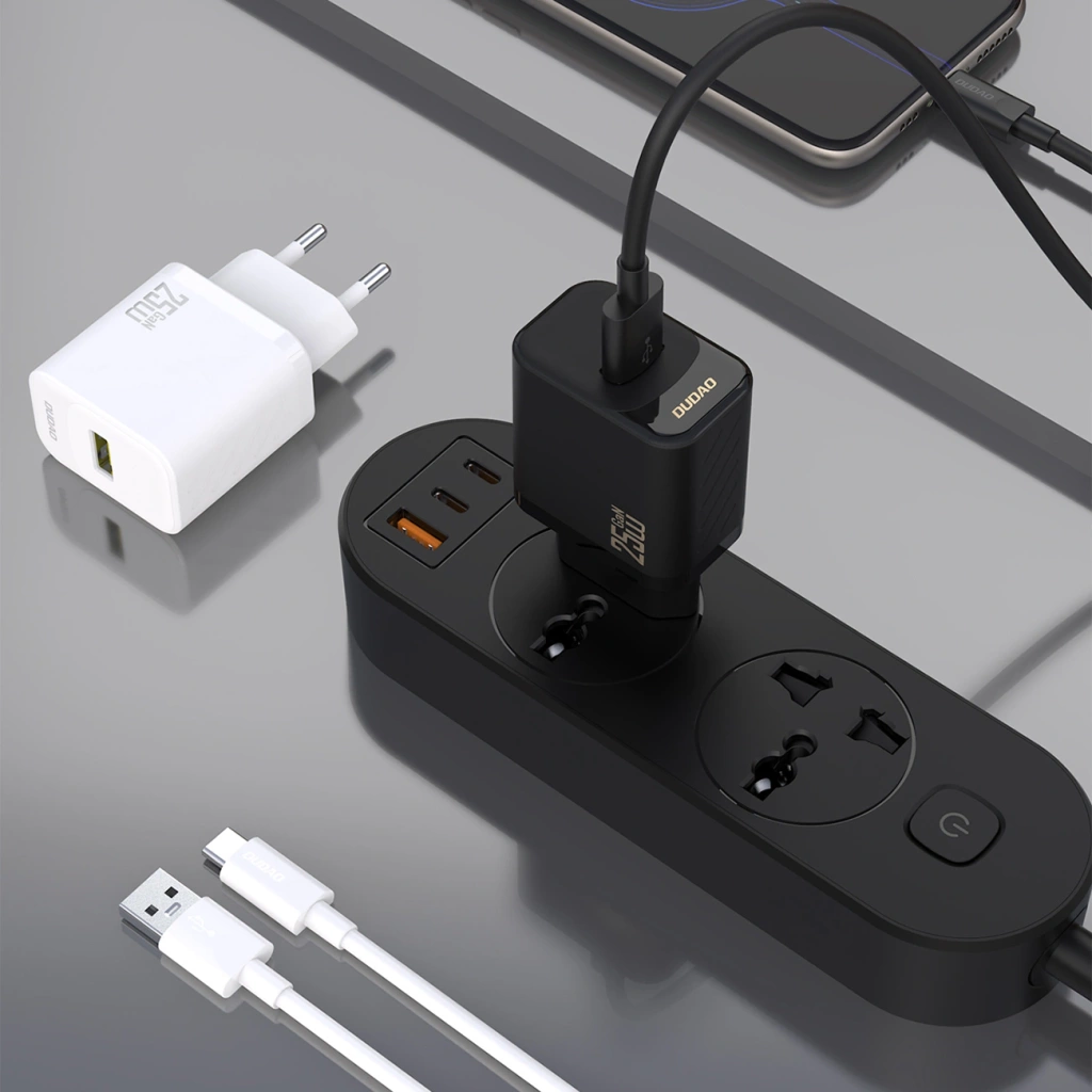 Ładowarka sieciowa Dudao A27STEU to kompaktowe i nowoczesne rozwiązanie do codziennego ładowania urządzeń mobilnych. Technologia GaN 25 W umożliwia szybkie i stabilne ładowanie przy zachowaniu niewielkich rozmiarów obudowy. Antypoślizgowa faktura poprawia chwyt i komfort użytkowania, a dołączony kabel USB-A - USB-C o długości 1 m zwiększa wygodę od razu po wyjęciu z pudełka. Zastosowany 9-warstwowy system zabezpieczeń wspiera bezpieczne ładowanie sprzętu. To praktyczny zestaw do domu, biura i podróży.