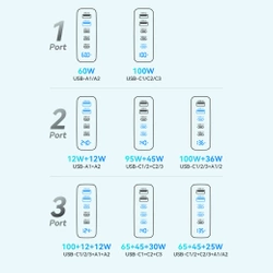 - USB-C 1 / USB-C 2 / USB-C 3 + USB-A 1 + USB-A 2: 100W + 12W + 12W