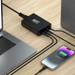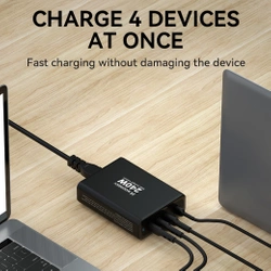 - Zapewnia jednoczesne ładowanie czterech urządzeń. Ładowarka posiada cztery porty ładowania: jeden USB-A i trzy USB-C.