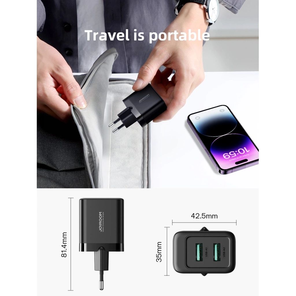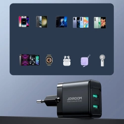 Technologia dwóch portów USB-A o mocy 2.4A każdy umożliwia szybkie i efektywne ładowanie dwóch urządzeń jednocześnie. Nie czekaj, aż jedno zakończy ładowanie - z Joyroom JR-TCN01 zyskujesz czas i komfort!