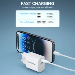 - Zapewnia optymalne ładowanie dla dwóch urządzeń jednocześnie. Ładowarka ma wbudowane porty USB-C i USB-A, które podłączone razem działają z mocą 15W.