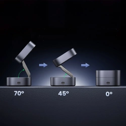 Kompaktowa i składana konstrukcja ładowarki sprawia, że jest łatwa do przenoszenia i przechowywania. Z wymiarami 60 x 60 x 49 mm i wagą zaledwie 205 g, zmieści się w każdej torbie, plecaku czy bagażu. Wbudowana przeciwwaga oraz silikonowe podkładki zapewniają stabilność urządzenia, co czyni ją idealną do użytku w domu, biurze oraz w podróży.
