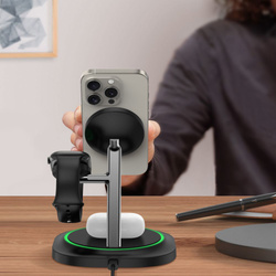 Model QI15W-A46 wyróżnia się nowoczesnym wyglądem oraz wbudowanym nastrojowym podświetleniem z możliwością wyboru aż 6 kolorów, które można dowolnie przełączać, dopasowując do otoczenia. Dzięki mocnym magnesom telefon pozostaje stabilnie zamocowany nawet w pozycji pionowej, co ułatwia korzystanie z funkcji FaceTime czy przeglądanie treści. Ładowarka jest kompatybilna z urządzeniami obsługującymi ładowanie bezprzewodowe, w tym iPhone’ami MagSafe, Apple Watch oraz słuchawkami AirPods.
