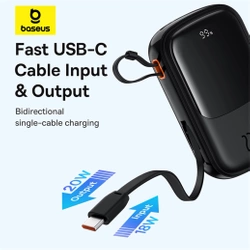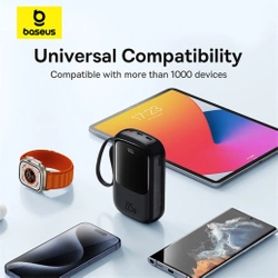 Wbudowany kabel USB-C zapewnia, że powerbank Baseus QPow Pro+ jest zawsze gotowy do akcji - niezależnie od tego, dokąd zmierzasz. Sprawdzi się na uczelni, na wyjeździe służbowym, podczas wakacji i we wszystkich innych miejscach, gdzie nie ma komfortowego dostępu do gniazdka. Co ważne, kabel może nie tylko ładować urządzenie zewnętrzne, ale również sam powerbank.