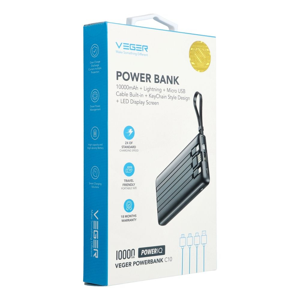 Power bank Veger C10 o pojemności 10 000 mAH do ładowania do 4 urządzeń jednocześnienadaje. Nadaje się do bezpośredniego użytku z większością najnowszych urządzeń na rynku. Inteligentny system zapobiega przeładowaniu, przepięciu, nadprądowej i zwarciu urządzeń. Powerbank posiada 4 wbudowane kable oraz 2 porty. Do ładowania urządzeń służą kable ze złączami: USB-C, Mico USB (z funkcją zawieszki), Lightning oraz port USB-A. Natomiast do ładowania powerbanka służy kabel ze złączem USB-A oraz port USB-C.