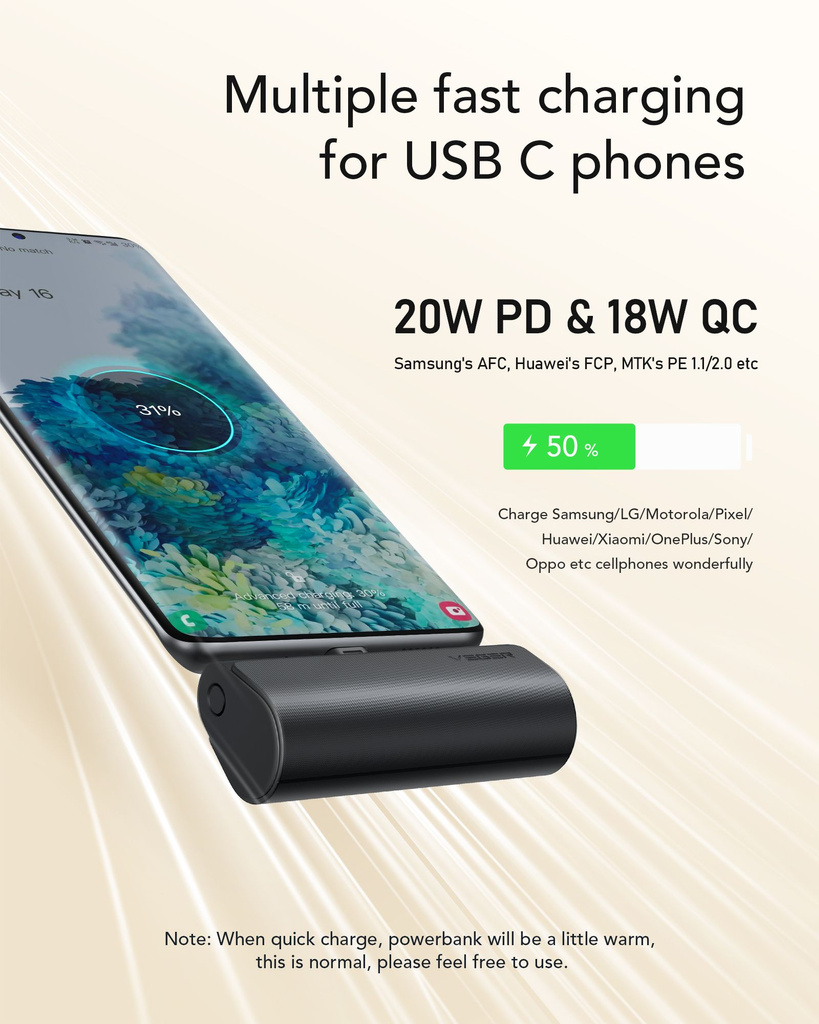 Power bank posiada wbudowane złącze USB-C. Podłącza się go się bezpośrednio do urządzenia, dzięki temu nie trzeba mieć dodatkowego kabla przy sobie.
