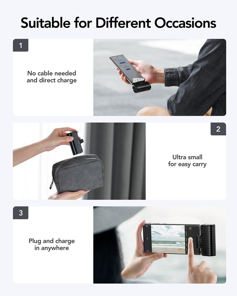 Power bank posiada wbudowane złącze USB-C. Podłącza się go się bezpośrednio do urządzenia, dzięki temu nie trzeba mieć dodatkowego kabla przy sobie.