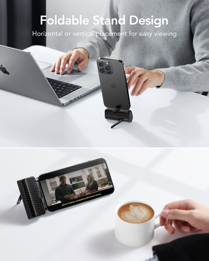 Składany stojak podtrzymuje smartfon w pionie i poziomie pod kątem odchylenia 68 stopni pozwalając na korzystanie ze smartfona podczas ładowania.