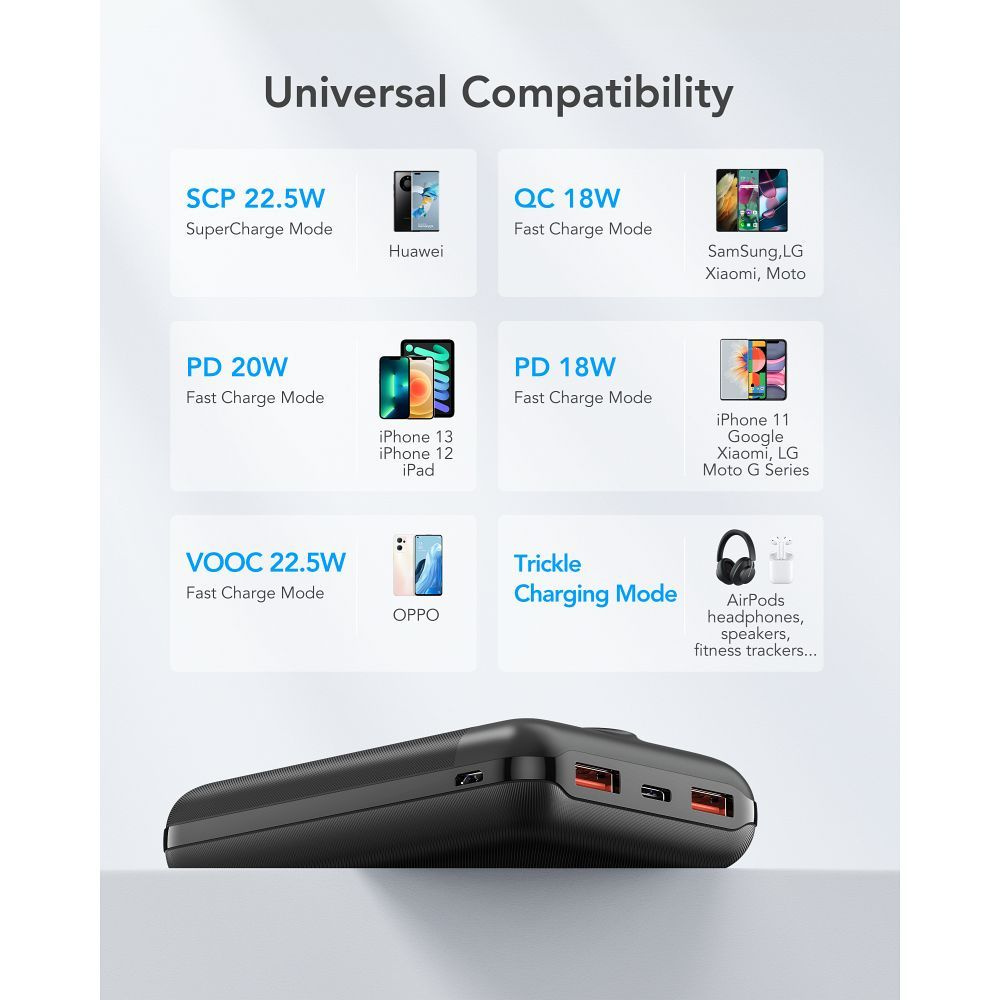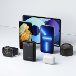 5 portów, w tym micro USB, 2x USB-C i 2x USB, obsługuje technologie szybkiego ładowania Power Delivery (22,5W) i Quick Charge 3.0, a do tego umożliwią naładowanie w tym samym czasie trzech urządzeń, np. smartfona, tablet, podręczną konsolę czy słuchawki typu TWS. Dzięki USB-C bez problemu podłączysz najnowszy sprzęt na rynku.