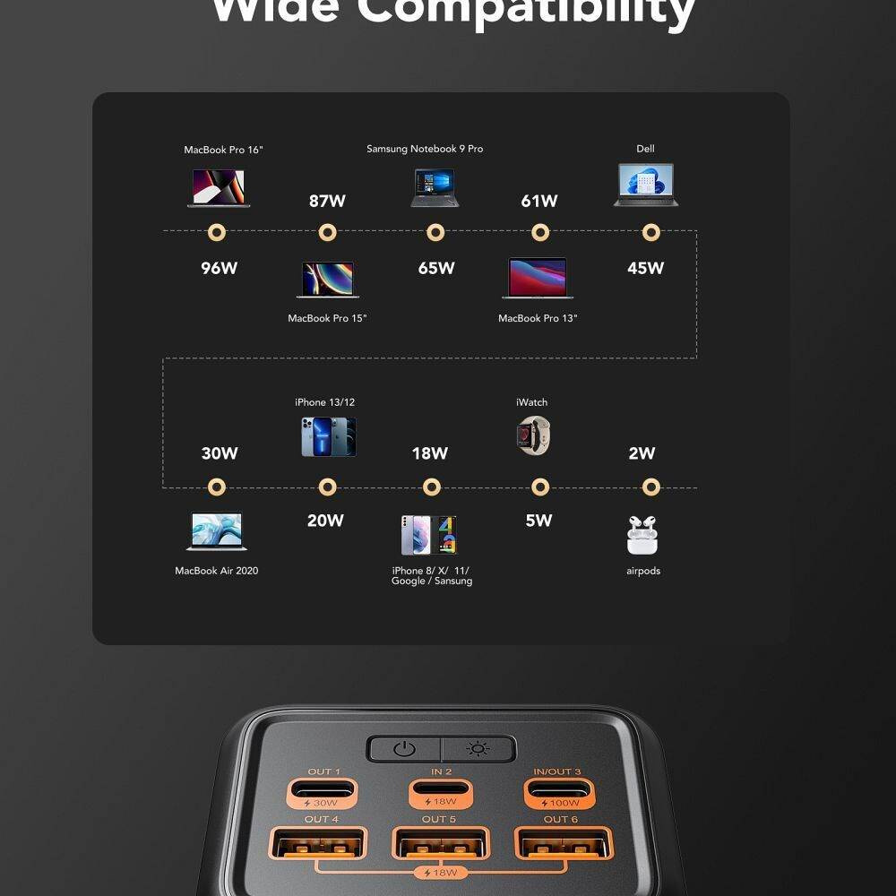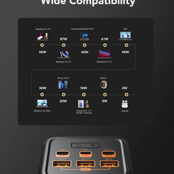 Sześć portów, w tym Lightning, 2x USB-C oraz 3x USB-A, obsługuje technologie Power Delivery (100 W + 30 W) i Quick Charge 3.0, co umożliwia ładowanie kilku urządzeń jednocześnie – smartfona, laptopa, tabletu, konsoli przenośnej lub słuchawek TWS. Dzięki portom Lightning i USB-C z łatwością podłączysz najnowsze urządzenia dostępne na rynku.
