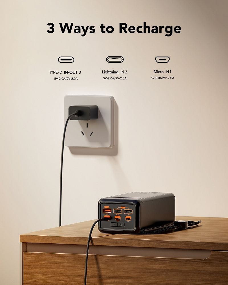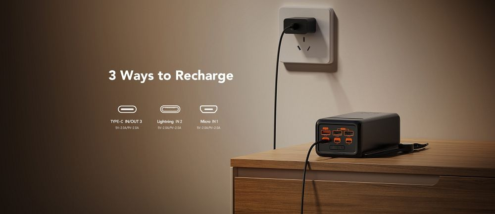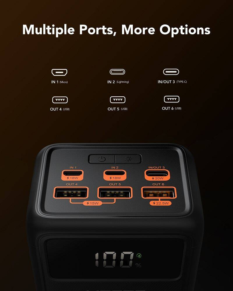 6 portów, w tym Micro USB, USB-C, Lightning i 3x USB, obsługuje technologie szybkiego ładowania Power Delivery (22,5 W) i Quick Charge 3.0, a do tego umożliwia naładowanie w tym samym czasie trzech urządzeń, np. smartfona, tablet, podręczną konsolę czy słuchawki typu TWS. Dzięki Lightning i USB-C bez problemu podłączysz najnowszy sprzęt na rynku.