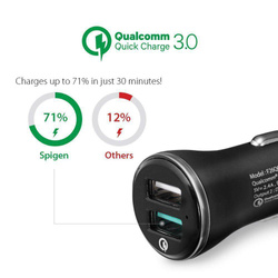 Ładowarka Spigen dysponuje dwoma portami USB z zaimplementowaną technologią szybkiego ładowania QuickCharge 3.0. Technologia ta pozwala na zmianę napięcia w przedziale 5-12V DC i prądu ładowania 1,5A (12V) do 3,0A (5V) co w smartfon'ach w procesorami Qualcomm pozwala na skrócenie czasu ładowania aż o 60%.