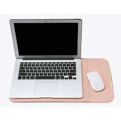 Dzięki gładkiej strukturze materiału i własnej długości futerał może zostać wykorzystany również jako podkładka pod komputer i mysz. Górna klapa etui wyposażona została w magnes zamykający co w praktyczny sposób ułatwia wyjmowanie urządzenia z pokrowca.