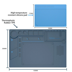 Zestaw składa się z idealnie dopasowanej podkładki silikonowej oraz maty zawierającej specjalne przegrody. Możesz w nich umieścić mi.in podzespoły telefonu, taśmę, akcesoria do lutowania, śrubokręty. Zawiera także siatkę pozycjonującą na śrubki oraz przestrzeń roboczą.