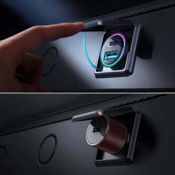 Dzięki kolorowemu pierścieniowi LED porty ładowania są zawsze widoczne. To funkcjonalność, która znacząco ułatwia podłączenie urządzeń w ciemności, dodając jednocześnie elegancki akcent do wnętrza Twojego samochodu.