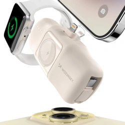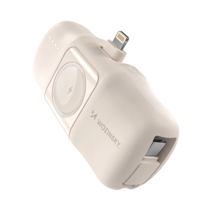 • Mini powerbank Wozinsky WF16-YLS 5000mAh 15W Lightning z wbudowanym kablem USB-C i ładowarką do Apple Watch - beżowy