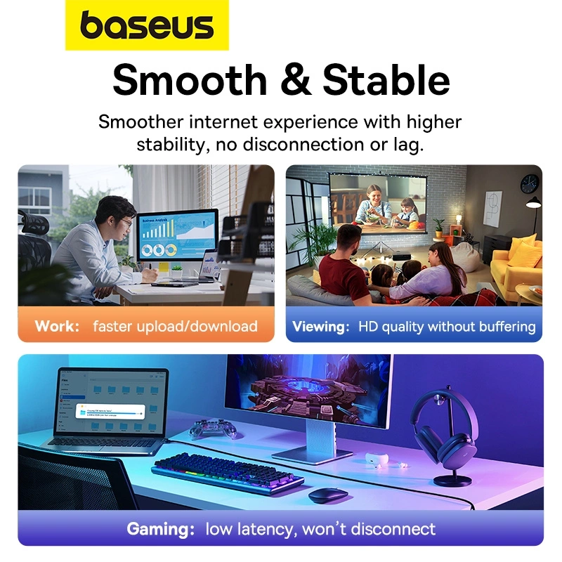 Baseus RJ45 dzięki swojej przemyślanej budowie zapewnia wyższą stabilność, dzięki czemu nie musisz obawiać się zakłóceń, opóźnień czy niechcianych rozłączeń. Doskonale nada się do pracy, ponieważ za jego pomocą możesz szybko pobierać i przesyłać pliki. Co więcej, gwarantuje jakość HD bez buforowania. Poznaj nowy komfort użytkowania, który zapewni Ci Baseus!
