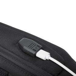 Wystarczy podłączyć powerbank wewnątrz plecaka i podpiąć telefon do portu USB, aby komfortowo ładować urządzenia nawet w ruchu.