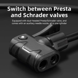 Zaprojektowana z myślą o łatwości i wygodzie użytkowania, podwójna głowica z blokadą umożliwia szybkie pompowanie zarówno wentyli Presta, jak i Schrader. Ta cecha czyni pompkę niezwykle funkcjonalną i przydatną dla każdego rowerzysty.