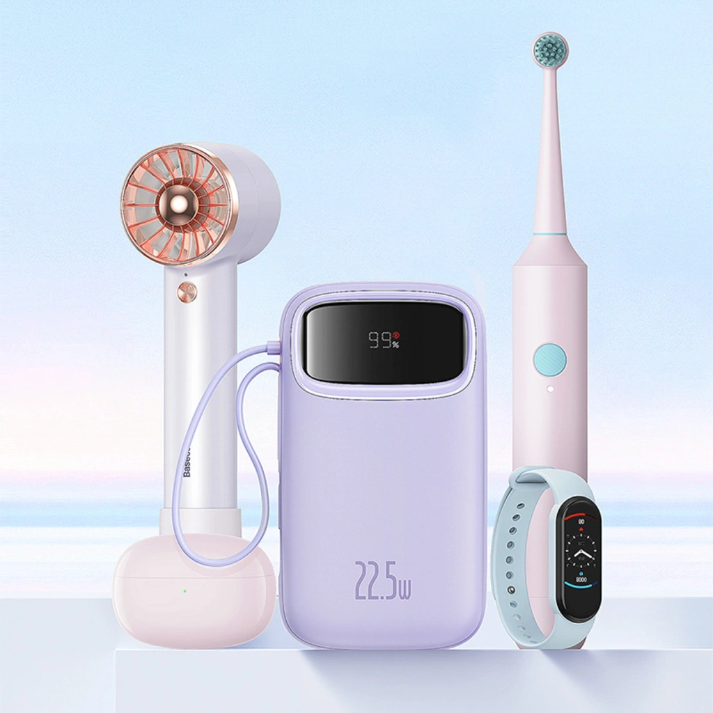 Smukła i ergonomiczna obudowa w kolorze fioletowym łączy estetykę z funkcjonalnością. Zwijane przewody chronią się przed uszkodzeniami i utrzymują porządek podczas podróży.