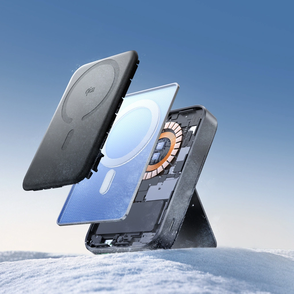 Dzięki mocnym magnesom powerbank doskonale przylega do kompatybilnych iPhone’ów i etui MagSafe, co zapewnia bezpieczne ładowanie bez potrzeby kabli.