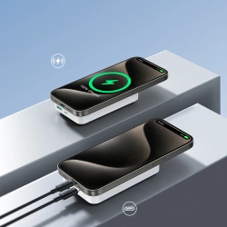 Powerbank Joyroom JR-W020 umożliwia błyskawiczne ładowanie trzech urządzeń w jednym czasie. Współpracuje z technologią MagSafe oraz posiada złącza USB-A i USB-C. Wspiera protokół szybkiego ładowania - Power Delivery. Posiada 10000 mAh pojemności, więc pozwala na ładowanie smartfonu, słuchawek czy małych urządzeń elektronicznych.