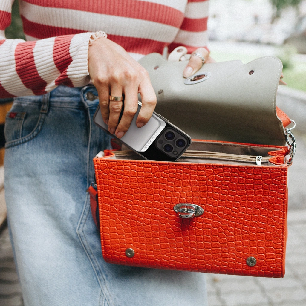 Smukła konstrukcja sprawia, że powerbank nie zasłania aparatu telefonu i łatwo mieści się w kieszeni.