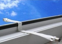 Za pomocą tego przewodu można przeprowadzić kabel koncentryczny z anteny bezpośrednio do odbiornika bez potrzeby uciążliwego wiercenia zbędnych otworów w ramach okna. Przejściówkę kładziemy po prostu na ramie okna i mocujemy je za pomocą specjalnej taśmy klejącej, która znajduje się już na przejściówce.