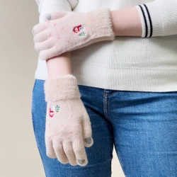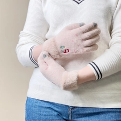 Rękawiczki zimowe do telefonu damskie z bałwankiem i choinką - beżowe