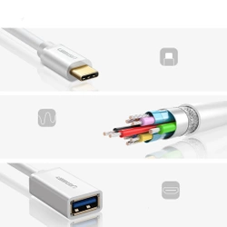 Adapter OTG UGREEN USB-A (żeński) do USB-C (męski) 3.0 to wysoka jakość, wytrzymałość, estetyka oraz wysoka prędkość transferu danych. Adapter wyposażony jest w kabel długości 15 cm. Wykonany został z odpornej na korozję miedzi ocynowanej, która wraz z wielowarstwową powłoką zabezpieczającą ogranicza utratę danych.