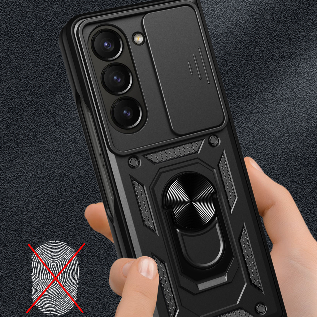 Pancerne etui z serii Hybrid Armor Camshield jest wykonane z termoplastycznego i wytrzymałego tworzywa, które swoim wyglądem imituje stal. Pokrowiec jest dopasowany do urządzenia, doskonale chroni telefon przed zniszczeniami wskutek upadków lub zarysowań (na przykład przez noszone w kieszeni klucze). Pokrowiec posiada przesuwaną osłonę na tylny aparat. Dzięki niej szkło kamery jest chronione przed porysowaniem. Jest do też dodatkowy plus dla osób ceniących prywatność i bezpieczeństwo swoich danych. Zakryta kamera uniemożliwia dostęp do nagrywania obrazu w przypadku kiedy ktoś uzyska zdalny dostęp do telefonu i włączy podgląd z głównej kamery. Podniesione krawędzie dookoła ekranu zabezpieczają go od zarysowania kiedy ten leży na płaskiej powierzchni. Ma wbudowany metalowy ring, który pozwala na wygodne korzystanie z telefonu jedną ręką i pełni również funkcję podstawki. Wbudowana metalowa płytka sprawia, że można go przymocować do magnetycznych uchwytów samochodowych. Posiada responsywne przyciski i wycięcia na porty. Idealny dla osób, które cenią sobie styl, jakość i chcą zadbać o swoje urządzenie.