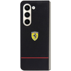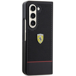 Etui Ferrari wyróżnia się perforowaną skórą ekologiczną, dzięki czemu etui przyciąga uwagę i staje się bardzo charakterystyczne. Centralnym elementem ozdabiającym każdy pokrowiec jest duże metalowe logo włoskiego giganta motoryzacyjnego - stanowi ona wyraźne nawiązanie do sportowego dziedzictwa marki Ferrari oraz prestiżu z nią związanego, a także potwierdza wysoką jakość produktu i luksusowy charakter. Uzupełnieniem tej kolekcji jest wąski, poziomo ułożony czerwony pasek - wspaniale kontrastuje z klasyczną czernią pokrowca.