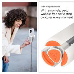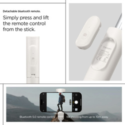 Dzięki odłączanemu pilotowi Bluetooth z dołączoną baterią możliwe jest wygodne robienie zdjęć zdalnie, bez potrzeby dotykania urządzenia. Innowacyjnym rozwiązaniem jest automatycznie rozkładający się statyw – nóżki wysuwają się samoczynnie po lekkim upuszczeniu kijka na podłoże, co ułatwia szybkie przejście z trybu selfie do trybu statywu.