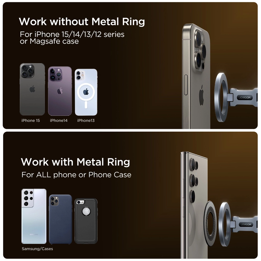Składany uchwyt Joyroom JR-ZS403 zapewnia bezpieczne i stabilne mocowanie smartfona. Dzięki wykorzystaniu potężnych magnesów neodymowych N52 oraz kompatybilności z systemem MagSafe telefon będzie stabilnie umocowany, by kierowca mógł się skupić na drodze. Składany design oraz regulowany zawias (270 stopni) oferują oszczędność miejsca i niezrównaną wygodę użytkowania.