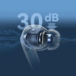 - Redukuje hałas z otoczenia, pozwalając zanurzyć się w muzyce. Funkcja ANC minimalizuje dźwięki zewnętrzne.