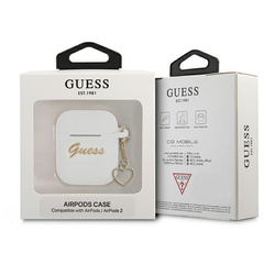 GUESS Silicone Charm Cover. Silikonowe etui chroni stację dokującą słuchawek bezprzewodowych Apple AirPods przed uszkodzeniem powierzchni i możliwą utratą. Wysokiej jakości silikonowa obudowa idealnie pasuje do oryginalnej obudowy AirPods i jest niezwykle przyjemna w dotyku. Etui wyróżniające się złotym logo Guess w stylu Vintage, dodatkowo z boku znajduje się złota zawieszka która sprawia że etui nabiera eleganckiego stylu.