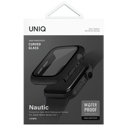 Uniq etui Nautic to smukły futerał ochronny z wodoodporną ochroną ekranu IP68. Technologia HydroDust Seal™ zapobiega przedostawaniu się wody do ekranu i nie wpływa na czułość dotyku. Konstrukcja case'a składa się z smukłego i eleganckiego etui ochronnego dokładnie okalającego kopertę zegaka Apple Watch i osłony ekranu wykonanej ze szkła hartowanego 9H zapewniającego extra przejrzystość HD. Łatwa konstrukcja zatrzaskowa nie wymaga demontażu paska na czas zakładania etui.