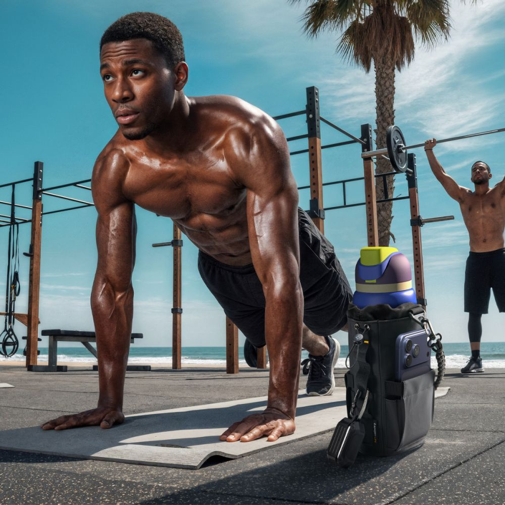 Uniwersalny rozmiar pomieści butelki o pojemności 590-1180 ml, shaker proteinowy oraz różne inne pojemniki na napoje. Regulowany ściągacz zapobiega przesuwaniu się butelki i dopasowuje się do jej wielkości. Dwie boczne kieszenie chronią telefon i mieszczą przekąski lub drobne akcesoria niezbędne podczas sportu. Wygodny pasek do ręki ułatwia przenoszenie, a trzy zewnętrzne pętelki pozwalają na zamocowanie karabińczyków, breloczków czy innych gadżetów.