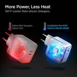 Dzięki zastosowanej technologii z użyciem Galium Nitride, ładowarka rozprasza mniej ciepła, co pozwala na błyskawiczne ładowanie przy zminimalizowanym rozmiarze urządzenia.