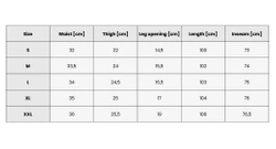 | Rozmiar | 1) Długość zewnętrzna (cm) | 2) Długość wewnętrzna (cm) | 3) Obwód talii (cm) | 4) Obwód uda (cm) |