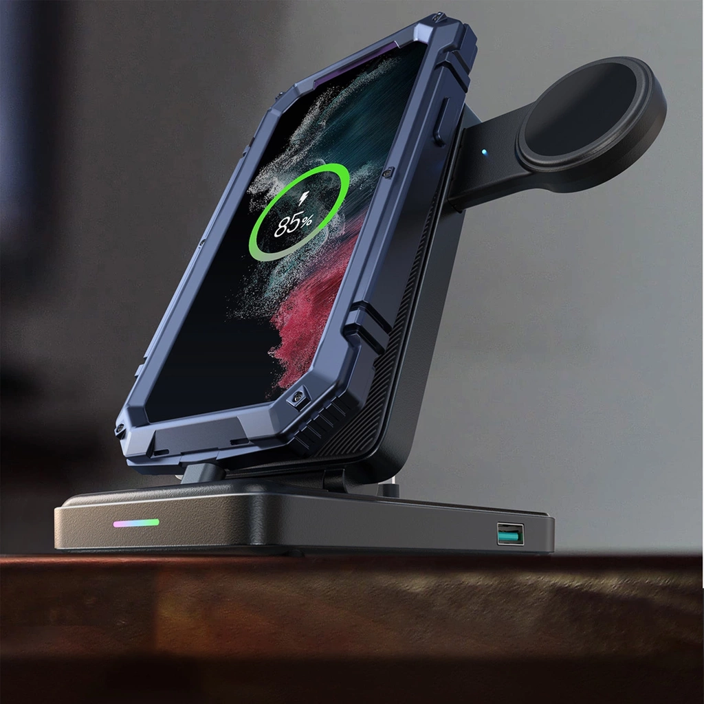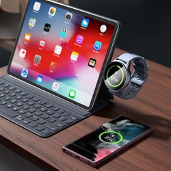 Stacja ładująca 4w1 Joyroom JR-WQS01 pozwala na na jednoczesne ładowanie telefonu, słuchawek i zegarka. Posiada możliwość regulacji, więc bez problemu wpasuje się w dowolną przestrzeń na biurku, stole lub półce. Wbudowane złącze USB-A zapewnia do 5 W mocy. Odłączana ładowarka do smartwatcha znacząco ułatwia przenoszenie i przechowywanie stacji ładującej.