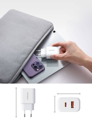 Szybka ładowarka z dwoma portami - USB-C oraz USB-A od Joyroom. Urządzenie jest małe i poręczne, dzięki czemu znajdzie się na nie miejsce nawet w damskiej torebce. Ten niezwykle praktyczny gadżet ma także szereg zabezpieczeń, dzięki którym korzystanie z niego jest wyjątkowo bezpieczne.