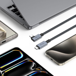 Uniwersalne złącza USB 4.0 umożliwiają kompatybilność z szeroką gamą urządzeń, od laptopów i tabletów, po smartfony i nowoczesne akcesoria. Posiada złącze pod kątem 90°, co umożliwia bardziej ergonomiczne i wygodne podłączanie urządzeń. Dzięki temu zmniejsza się zużycie samego kabla, co przekłada się na jego trwałość i dłuższą żywotność.