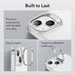 Oprócz standardowej, podwyższonej osłony wokół obiektywów, etui zostało dodatkowo wyposażone w metalową, otwieraną ramkę, którą w prosty sposób można przekształcić w funkcjonalną podstawkę. Posiada osłony na przyciski i wycięcia na porty.